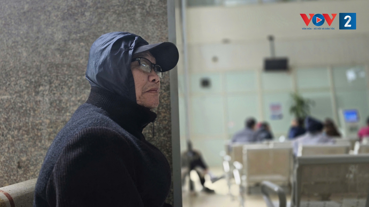 Thời tiết Hà Nội rét đậm, chiếc ghế đá lạnh hơn. Ông kéo chiếc mũ áo phao che kín đầu, miệng bịt khẩu trang, đôi tay lồng vào trong phần nách áo. Ông đang chờ bà ở khu xạ trị.