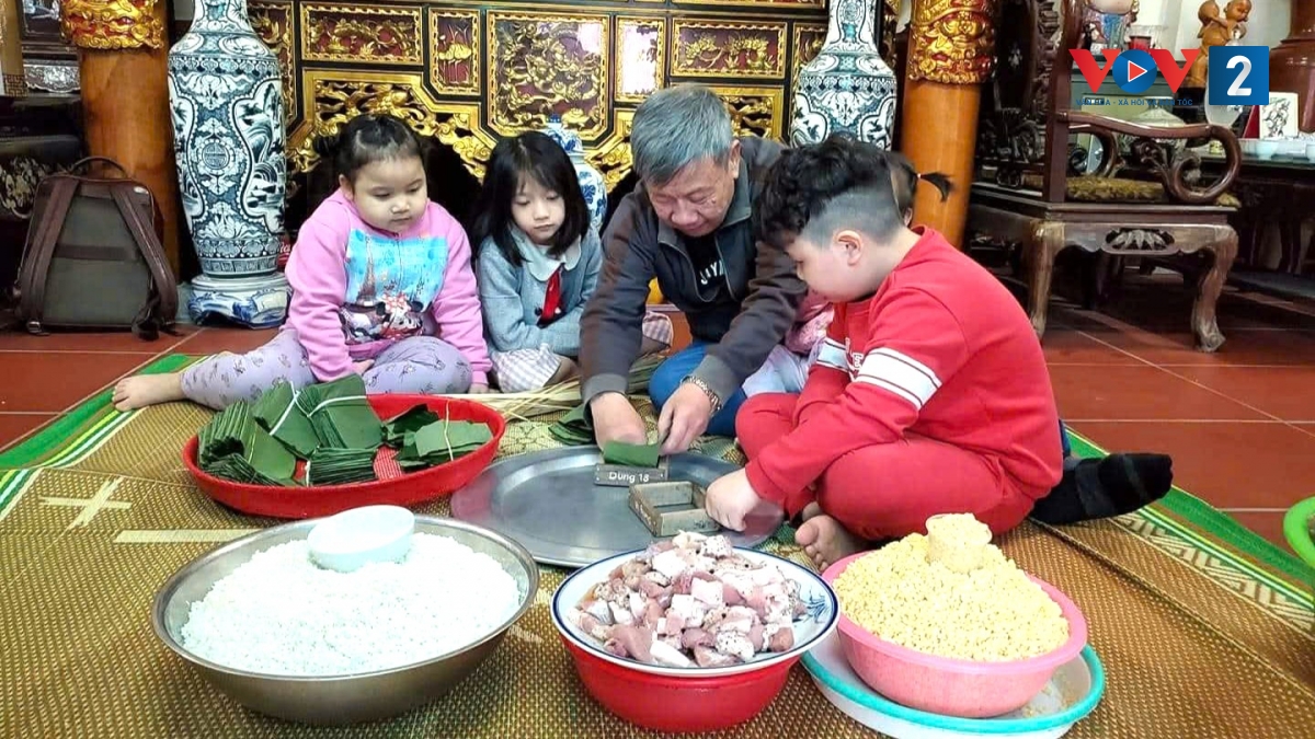 Còn với bà, dẫu bận rộn hơn từ rửa lá, lau khô, ngâm gạo, làm nhân bánh… nhưng cái sự vội vã, luống cuống mới đúng là Tết. Các cháu nhỏ nghỉ học sẽ đến nhà ông bà để cùng ông đổ gạo vào khuôn và gói bánh.