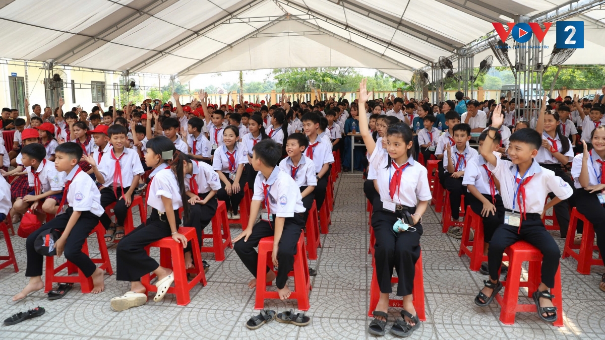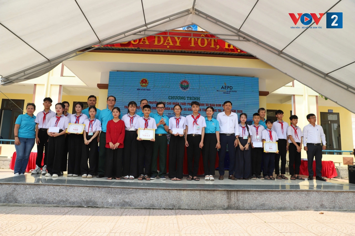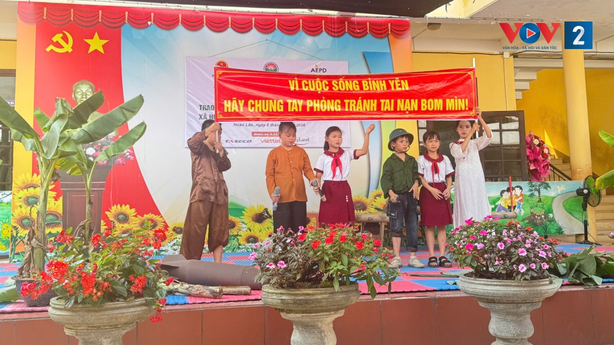 Trong khuôn khổ chương trình, hơn 1.000 người là đại biểu 2 xã, các thầy cô giáo, các em học sinh và người dân địa phương đã được lắng nghe buổi tuyên truyền nâng cao nhận thức phòng tránh tai nạn bom mìn do các em học sinh Trường THCS Liên Trạch (xã Bắc Trạch) và trường Tiểu học phổ thông Hòa Trạch (xã Hoàn Lão) thực hiện.