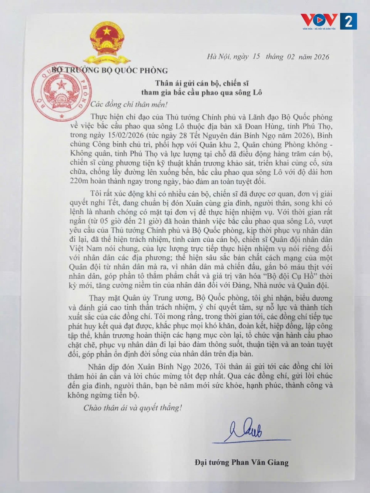 Không dừng lại ở những lời động viên chung, trong ngày 15/2/2026 (tức 28 Tết), Bộ trưởng Bộ Quốc phòng tiếp tục gửi Thư biểu dương, động viên cán bộ, chiến sĩ trực tiếp tham gia bắc cầu phao qua sông Lô, thuộc địa bàn xã Đoan Hùng, tỉnh Phú Thọ.
