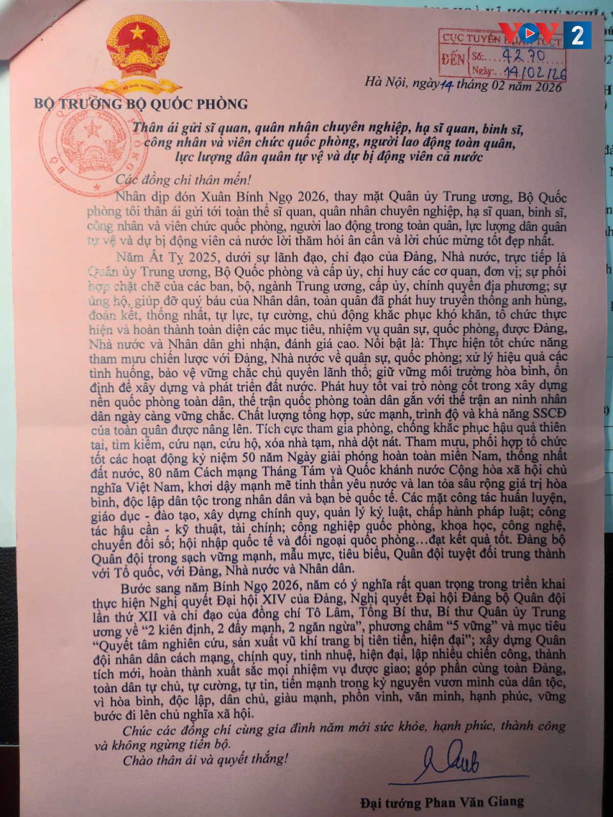 Khi mỗi gia đình sum họp bên mâm cỗ Tết, nơi biên cương, hải đảo, vùng sâu, vùng xa và trên mọi hướng chiến lược của Tổ quốc, hàng vạn cán bộ, chiến sĩ Quân đội Nhân dân Việt Nam vẫn đang ngày đêm vững vàng nơi tuyến đầu. Trong thời khắc đất trời chuyển mình sang Xuân Bính Ngọ 2026, Đại tướng Phan Văn Giang, Ủy viên Bộ Chính trị, Phó Bí thư Quân ủy Trung ương, Bộ trưởng Bộ Quốc phòng, đã gửi Thư chúc Tết tới toàn thể cán bộ, chiến sĩ và lực lượng vũ trang cả nước.