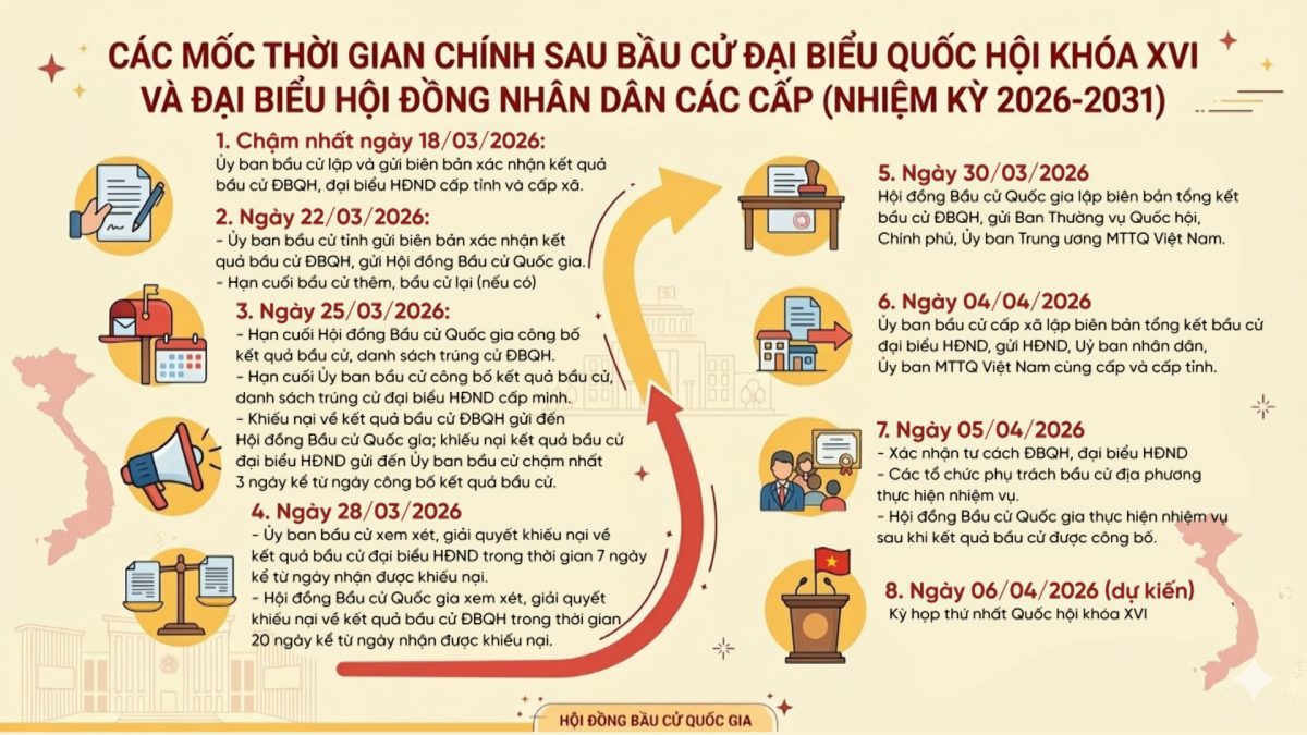 [VOV2] - Hội đồng Bầu cử Quốc gia và Ủy ban Bầu cử các địa phương đang tiếp tục triển khai nhiều công việc quan trọng để hoàn tất quy trình bầu cử theo đúng quy định của pháp luật. VOV2 trân trọng giới thiệu một số mốc thời gian quan trọng sau bầu cử.