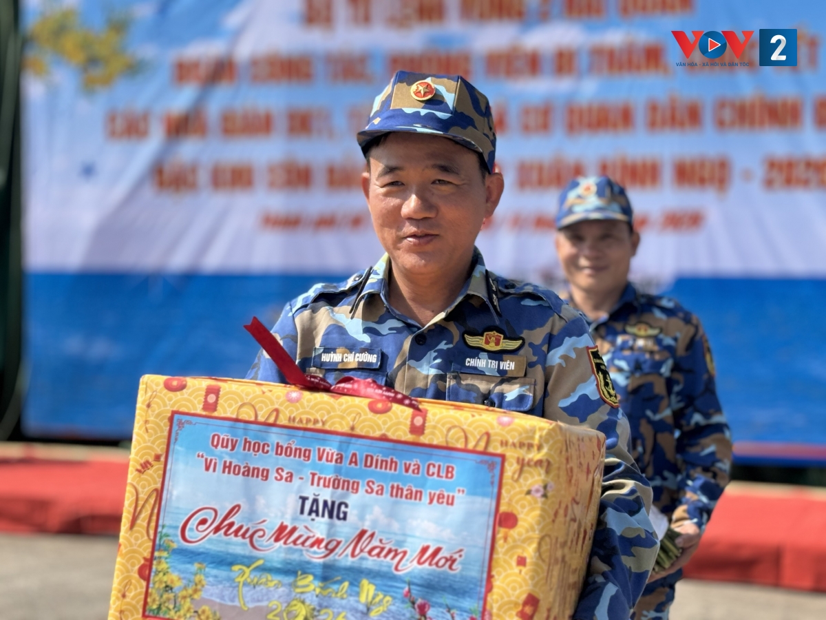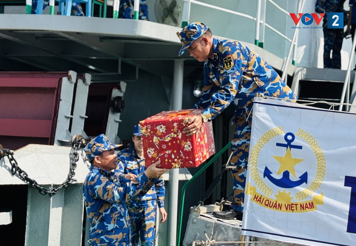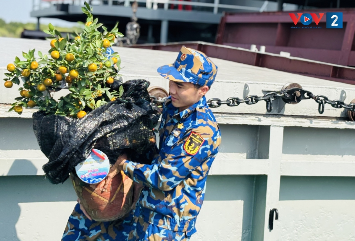 Trước đó, sáng 15/1, hàng tấn quà Tết đã được sắp xếp, bốc xếp lên tàu, gồm gạo nếp, lá dong, đậu xanh, mứt, bánh kẹo, hoa đào, hoa mai, cành quất… cùng các nhu yếu phẩm thiết yếu phục vụ sinh hoạt của bộ đội.