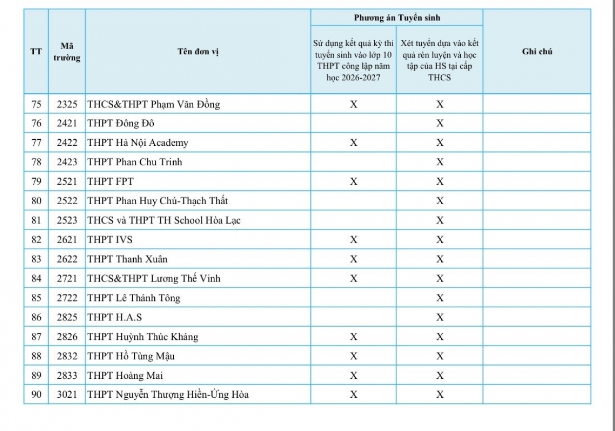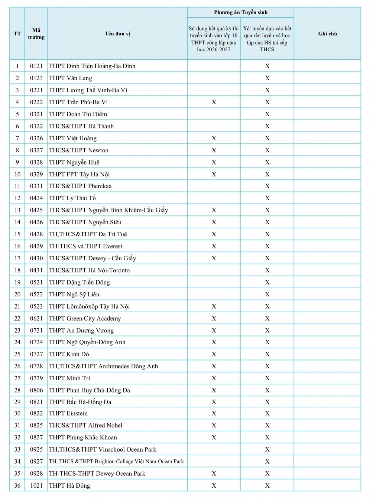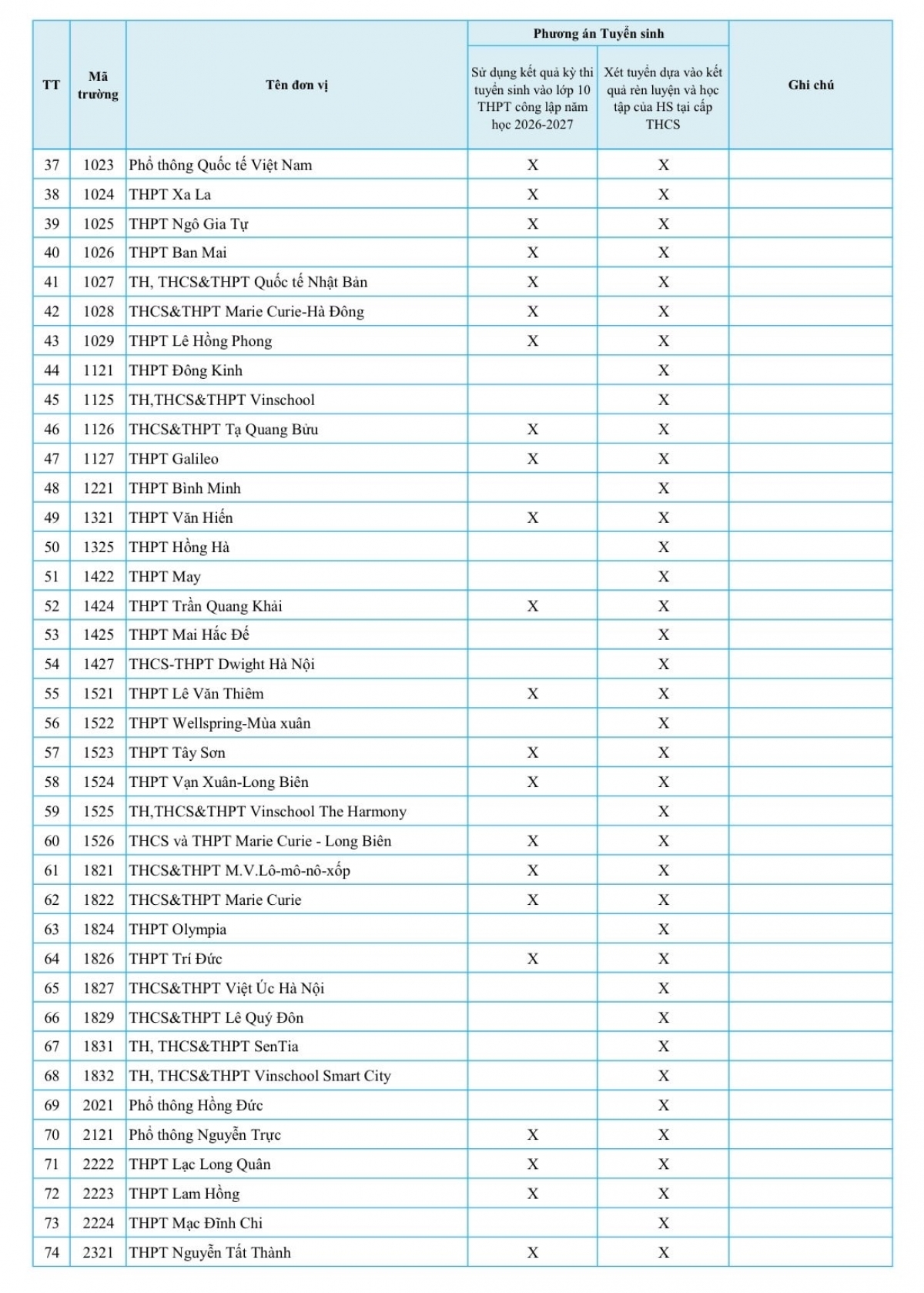 Tuy nhiên, trong danh sách này, có 56 trường xét tuyển dựa vào kết quả kỳ thi tuyển sinh vào lớp 10 công lập do Sở GD-ĐT Hà Nội tổ chức. Tức là sử dụng cả hai phương án xét tuyển: kết quả học bạ và kết quả thi vào lớp 10.