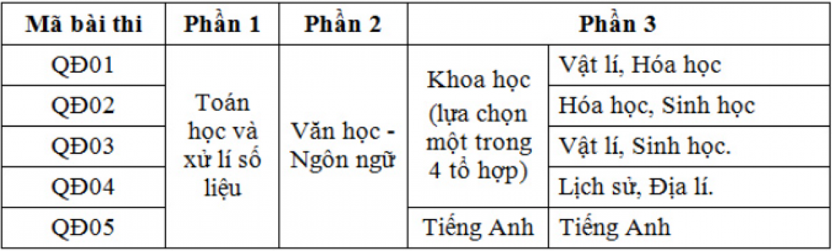 Phần 3 (Khoa học hoặc Tiếng Anh): 60 phút, 50 câu hỏi (trắc nghiệm khách quan 04 lựa chọn và điền đáp án); thang điểm: 50. Thí sinh lựa chọn phần thi Khoa học hoặc Tiếng Anh: