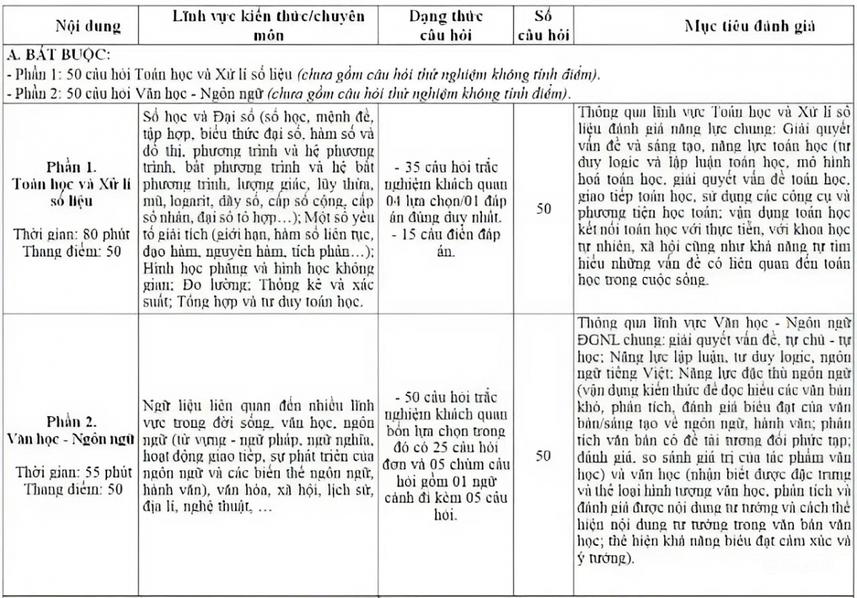 Phần 2 (Văn học - Ngôn ngữ /Tư duy định tính): 55 phút, 50 câu hỏi (trắc nghiệm khách quan 4 lựa chọn) trong đó có 25 câu hỏi đơn và 05 chùm câu hỏi gồm 1 ngữ cảnh đi kèm 05 câu hỏi; thang điểm: 50.