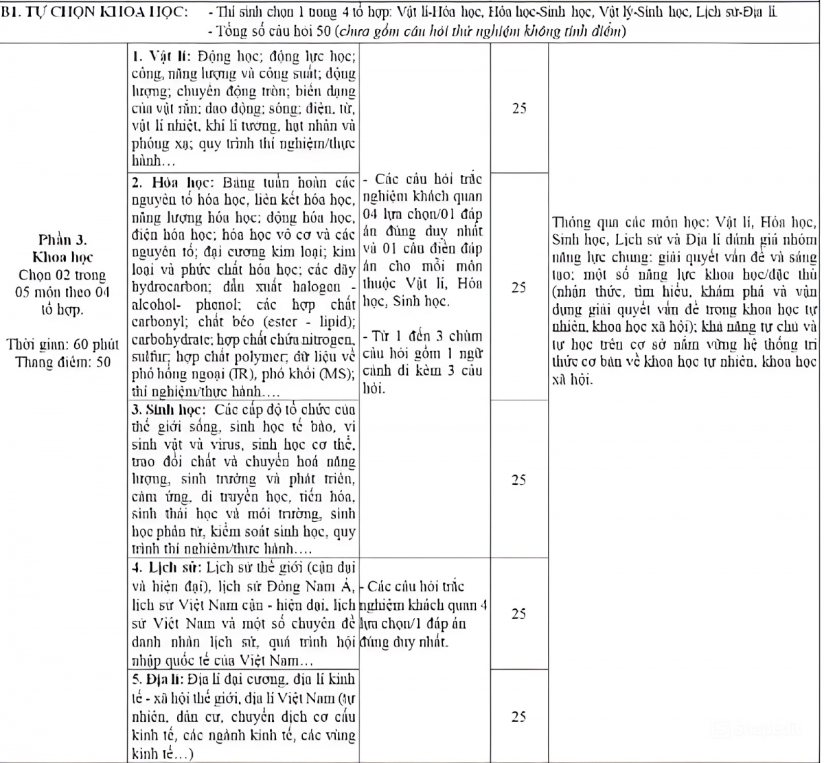Mỗi môn trong tổ hợp có 25 câu hỏi, trong đó có các câu hỏi đơn và từ 01 đến 03 chùm câu hỏi gồm 01 ngữ cảnh đi kèm 03 câu hỏi. Mỗi môn trong tổ hợp thuộc lĩnh vực tự nhiên có 01 câu hỏi điền đáp án.