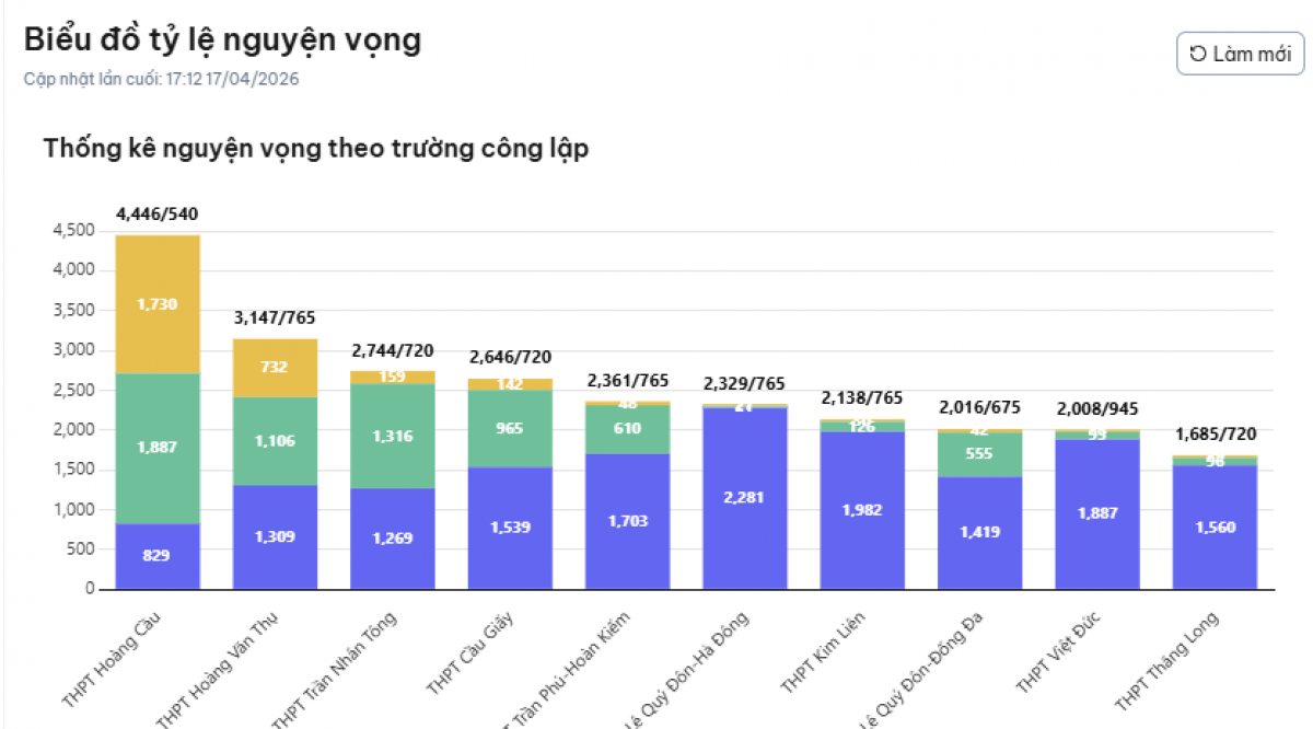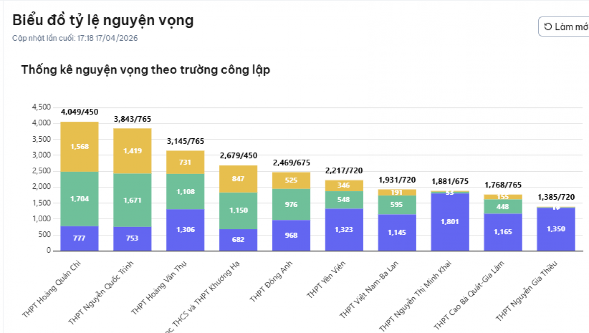 Theo dữ liệu được cập nhật vào 17h ngày 17/4, trường THPT Quán Chi - dù mới đi vào hoạt động, với 450 chỉ tiêu nhưng đã nhận tới hơn 4000 nguyện vọng (NV) 1,2,3. Đáng chú ý, số lượng NV này cao hơn so với ngày trước đó (16/4 khoảng 3.500 NV). Với dữ liệu cập nhật thì tỷ lệ chọi vào trường này tạm thời là 1/9.
