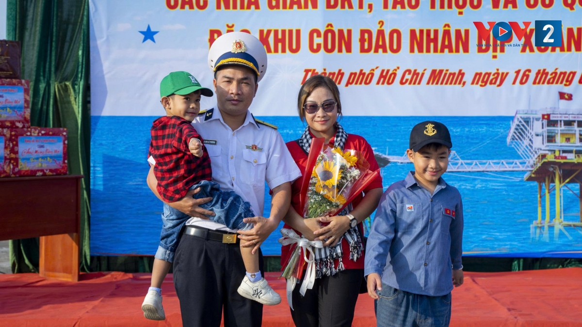 Mong mỏi của cậu học trò lớp 3 đã trở thành hiện thực. Sau những ngày vượt biển, đoàn công tác của Vùng 2 Hải quân đã đặt chân tới nhà giàn đầu tiên trong chuyến hải trình. Mẹ của Khang - chị Nguyễn Thị Thùy Dương, thành viên Hội Biển đảo Việt Nam là một trong những thành viên đoàn công tác.