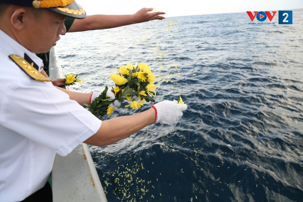 Trên Tàu Trường Sa 19, vòng hoa tươi, những con hạc giấy, từng bông cúc được thả trôi, hòa vào sóng biển, gửi vào lòng thành kính, sự biết ơn và khâm phục những người lính biển đã mãi mãi ở lại biển khơi vì sự bình yên của Tổ quốc.