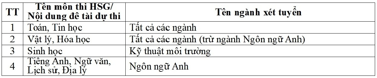 Việc xét tuyển thẳng áp dụng với thí sinh đoạt giải nhất, nhì, ba trong kỳ thi chọn học sinh giỏi quốc gia, quốc tế hoặc cuộc thi khoa học, kỹ thuật cấp quốc gia, quốc tế do Bộ GD-ĐT tổ chức, cử tham gia. Thời gian đoạt giải không quá 3 năm tính tới thời điểm xét tuyển. Thí sinh đã tốt nghiệp THPT, được xét tuyển thẳng vào trường theo ngành phù hợp với môn thi.