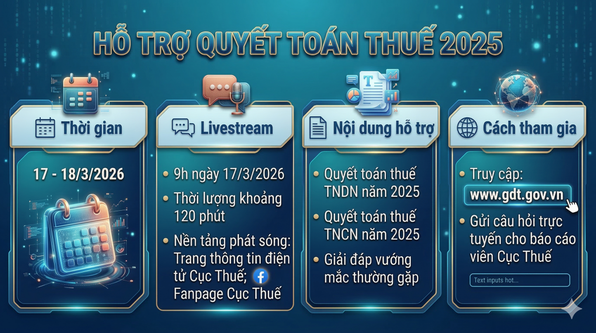Bên cạnh đó, phiên livestream hỗ trợ quyết toán thuế sẽ bắt đầu từ 9 giờ ngày 17/3/2026, với thời lượng khoảng 120 phút, được phát trên fanpage của Cục Thuế nhằm giải đáp trực tiếp các vướng mắc phổ biến khi thực hiện quyết toán thuế.