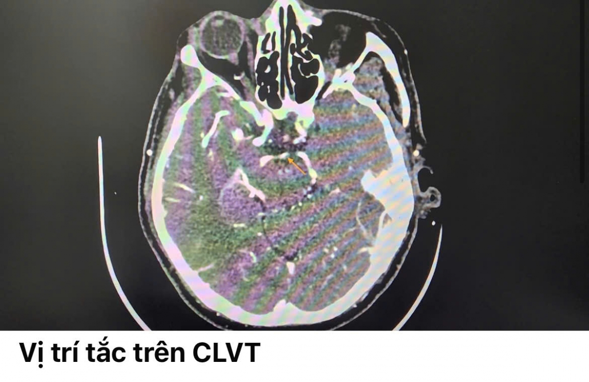 Tuy nhiên, khoảng 1 giờ sau đó, bệnh nhân đột ngột bị sụp mí, yếu liệt nửa người trái, nói khó, cơ lực chỉ còn 2/5. Kết quả chụp cắt lớp vi tính mạch não cho thấy bệnh nhân bị tắc cấp động mạch thân nền.