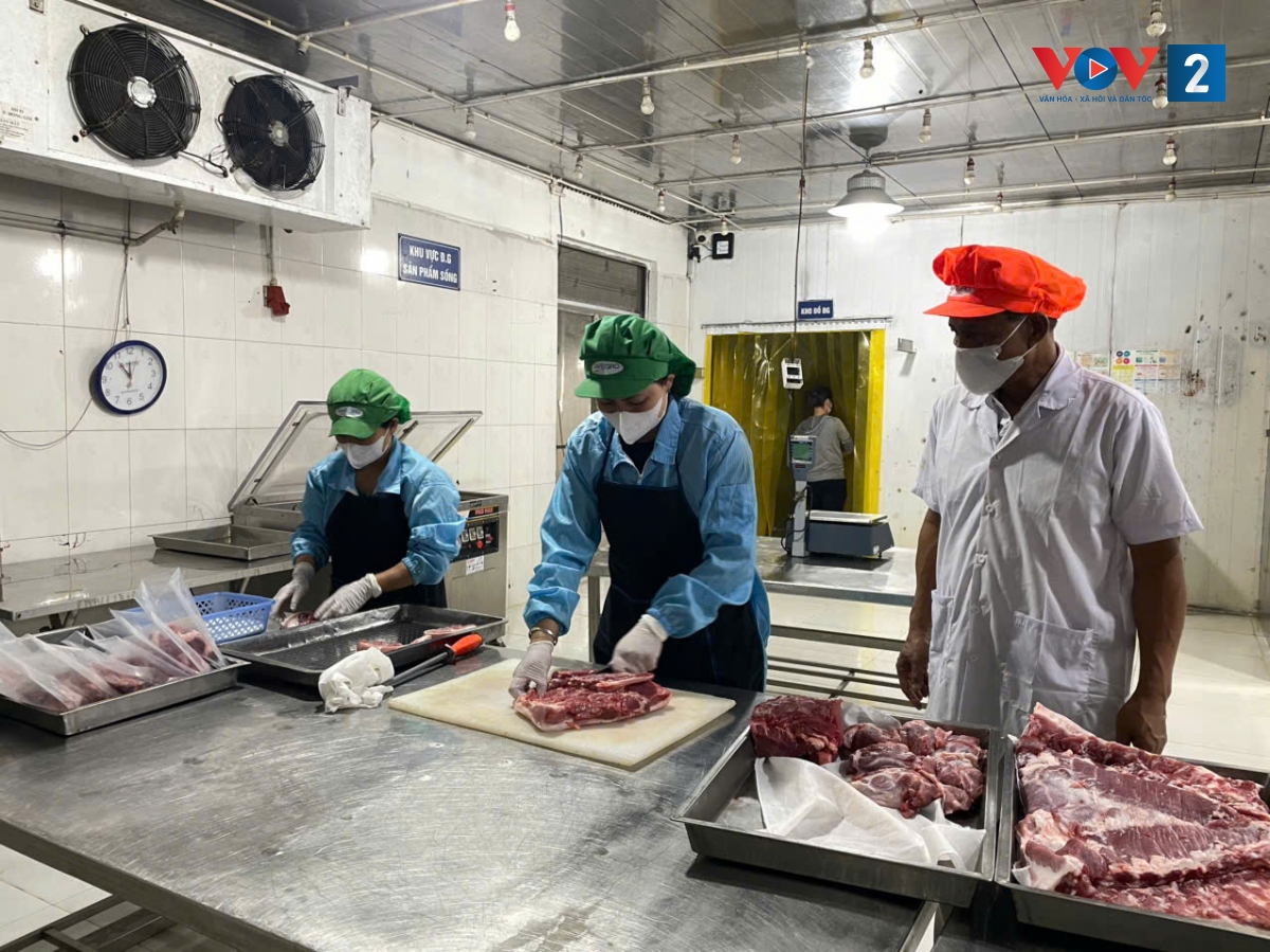 Khu giết mổ của HTX Hoàng Long, được đặt ngay trong trang trại. Quy trình giết mổ được áp dụng theo công nghệ Hà Lan đảm bảo an toàn thực phẩm. Sau giết mổ là công đoạn pha lóc, đóng gói – nơi các tiêu chuẩn an toàn tiếp tục được siết chặt.