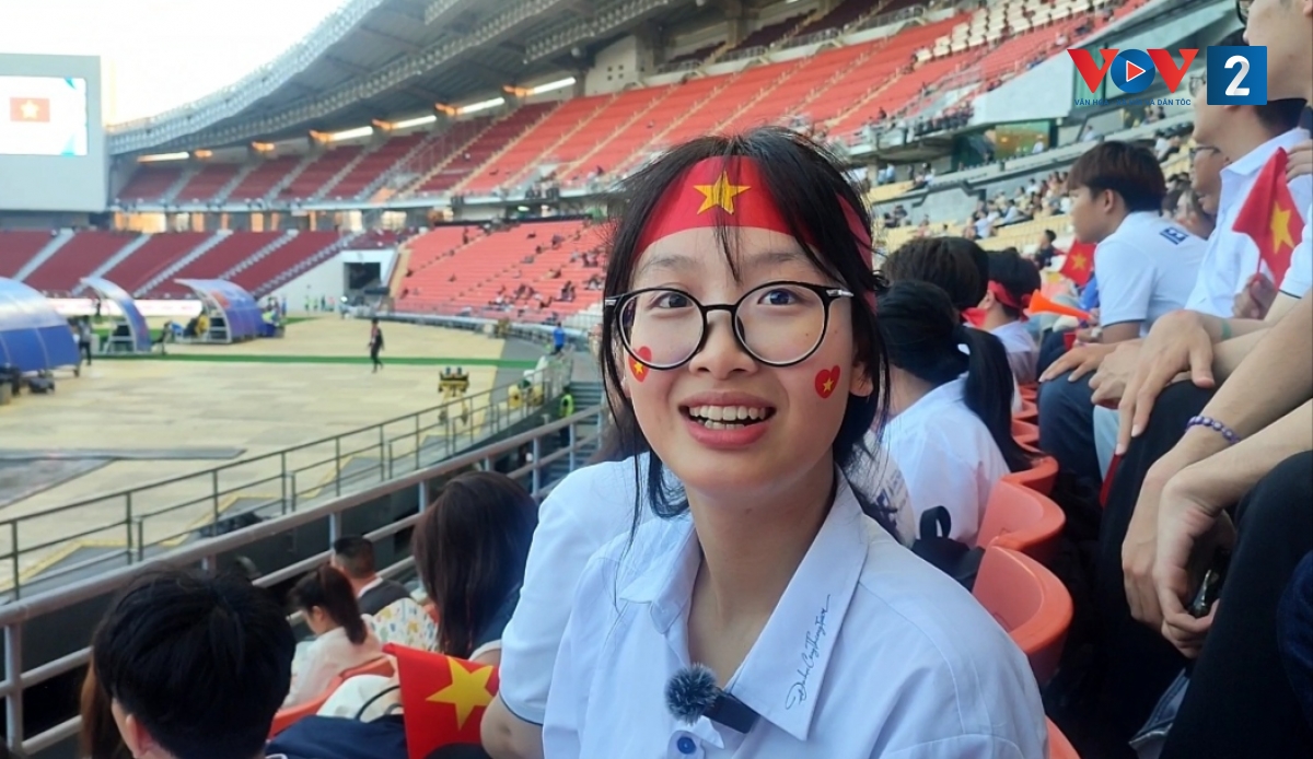 “Em cảm thấy Thái Lan là đất nước rất là tuyệt vời, mọi người rất thân thiện, hoà đồng, cũng như cơ sở hạ tầng rất phát triền. Còn về tinh thần thể thao tại Thái Lan thì em thấy tuyệt vời không kém, đặc biệt là em thấy sân Rajamangala rất đẹp. Xem đội U22 Việt Nam thì em chú ý đến anh thủ môn, em nghe nói anh ấy cao 1m9” - Vương Thị Nhung - sinh năm 2007, là một trong 60 CĐV mặc áo trắng giữa những hàng ghế màu đỏ trên khán đài sân Rajamangala.