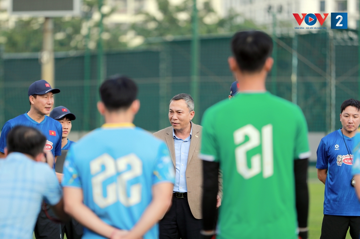Trong buổi gặp mặt, Chủ tịch Trần Quốc Tuấn một lần nữa biểu dương tinh thần thi đấu và kết quả của toàn đội tại SEA Games 33, đồng thời nhắc lại yêu cầu rất rõ ràng: sớm khép lại niềm vui sau chức vô địch để tập trung tối đa cho nhiệm vụ mới ở sân chơi châu Á – nơi U23 Việt Nam sẽ đối đầu những đội bóng hàng đầu lục địa, với cường độ và áp lực lớn hơn rất nhiều. Ông cũng khẳng định lực lượng U23 hiện tại chính là nòng cốt cho mục tiêu cạnh tranh ở Vòng loại World Cup 2030, vì vậy từng cầu thủ cần ý thức rõ trách nhiệm, giữ kỷ luật và thái độ chuyên nghiệp trong cả tập luyện lẫn thi đấu.
