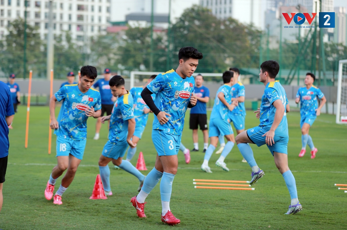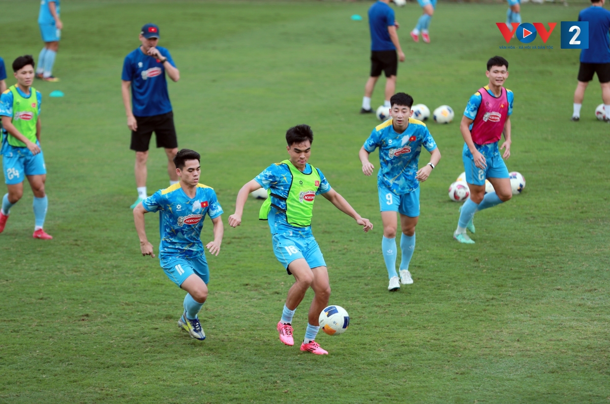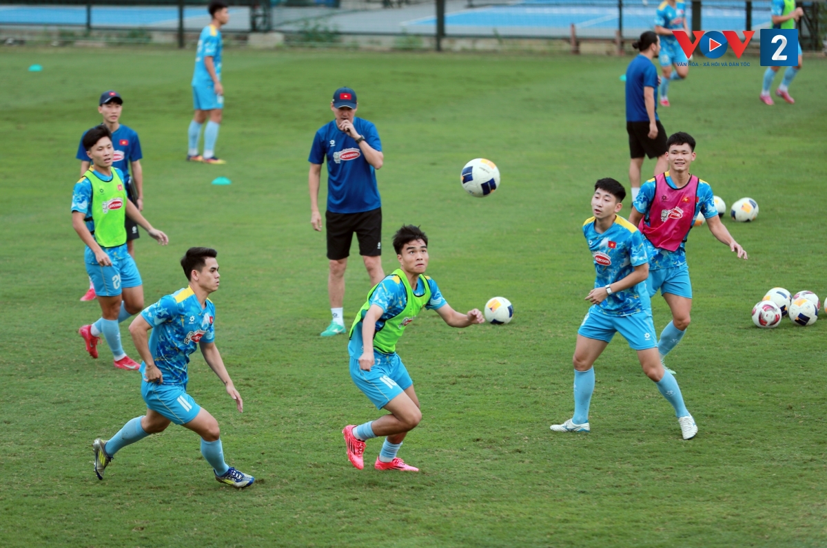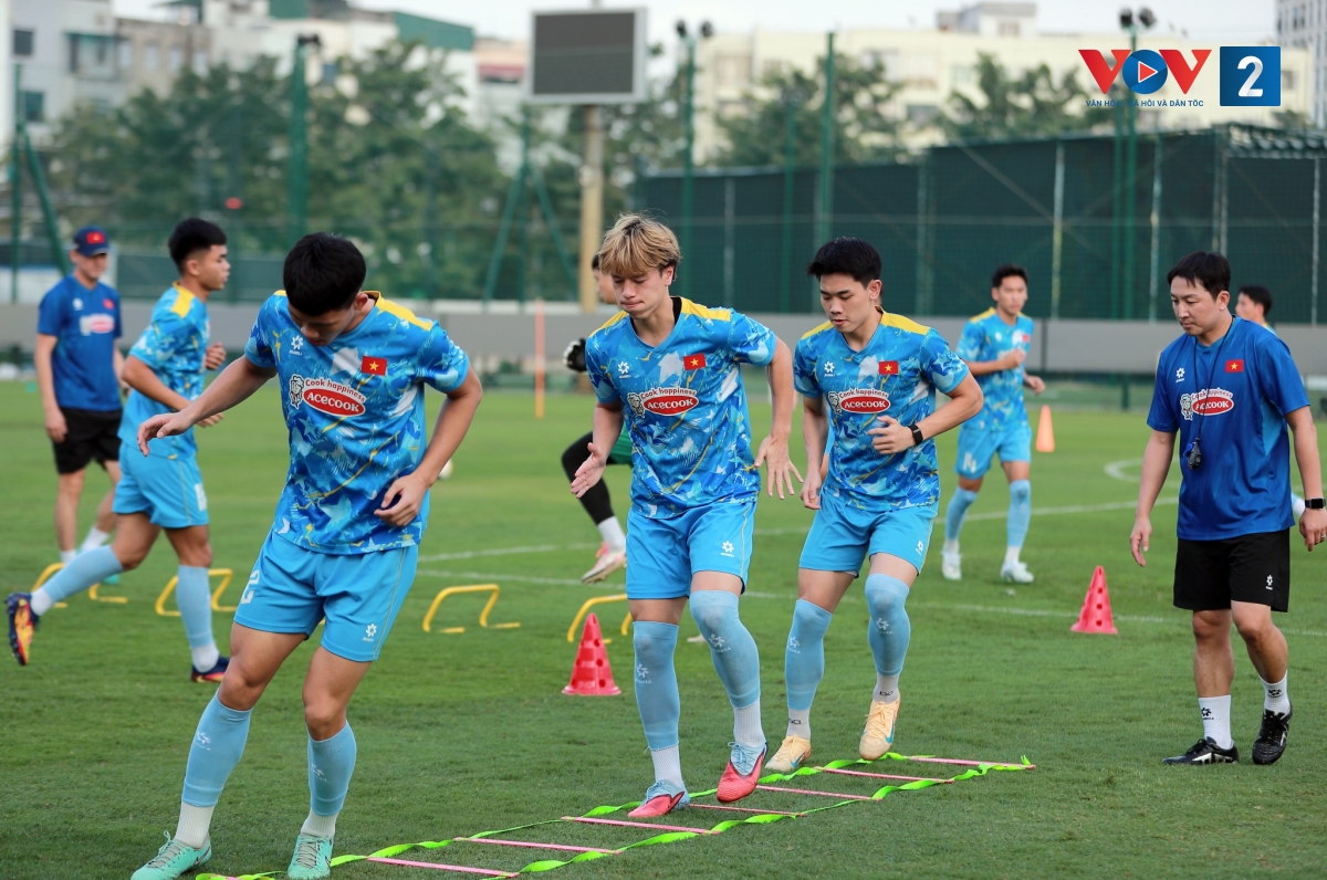 Trong khi đó, dưới sân tập, thầy trò HLV Kim Sang-sik bước vào buổi tập thứ hai với khối lượng vừa phải nhưng yêu cầu cao về tính tổ chức. Ban huấn luyện tập trung nhiều vào các bài phối hợp nhóm nhỏ, thoát pressing từ phần sân nhà và chuyển đổi trạng thái nhanh khi giành lại bóng. Những nội dung này được coi là điểm cần cải thiện sau SEA Games 33, đồng thời phù hợp với yêu cầu khi đối đầu các đối thủ mạnh, có khả năng áp sát và gây sức ép liên tục.