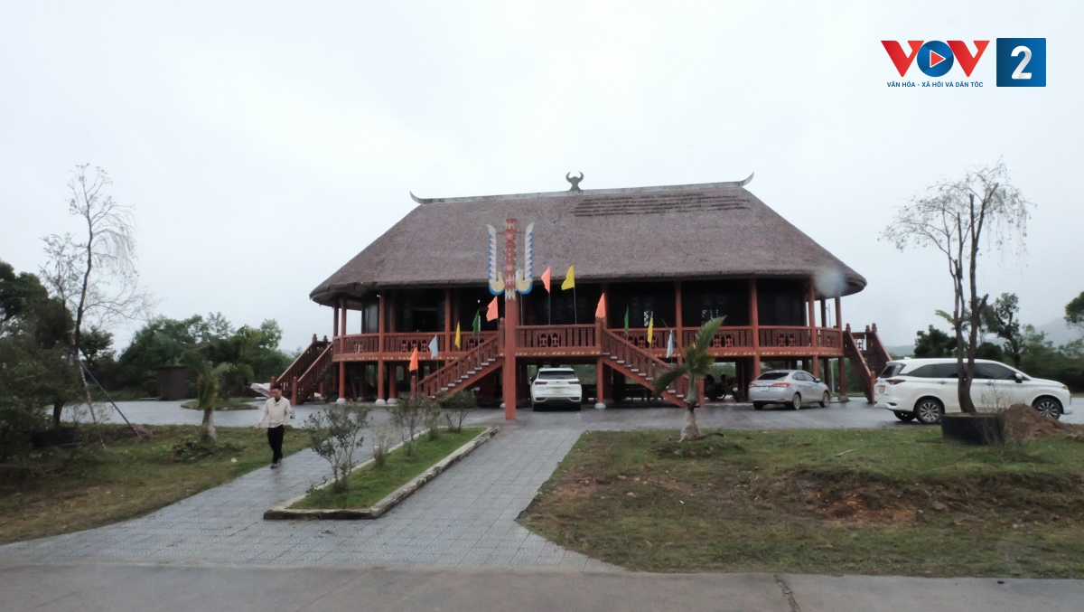 Nổi bật giữa làng là ngôi nhà sàn kiến trúc Gươl truyền thống bề thế với mái uốn cong hình mai rùa, lợp lá dày dặn. Trước sân, cây Nêu vươn thẳng lên bầu trời với những tua rua ngũ sắc như tín hiệu mời gọi thần linh và du khách.
