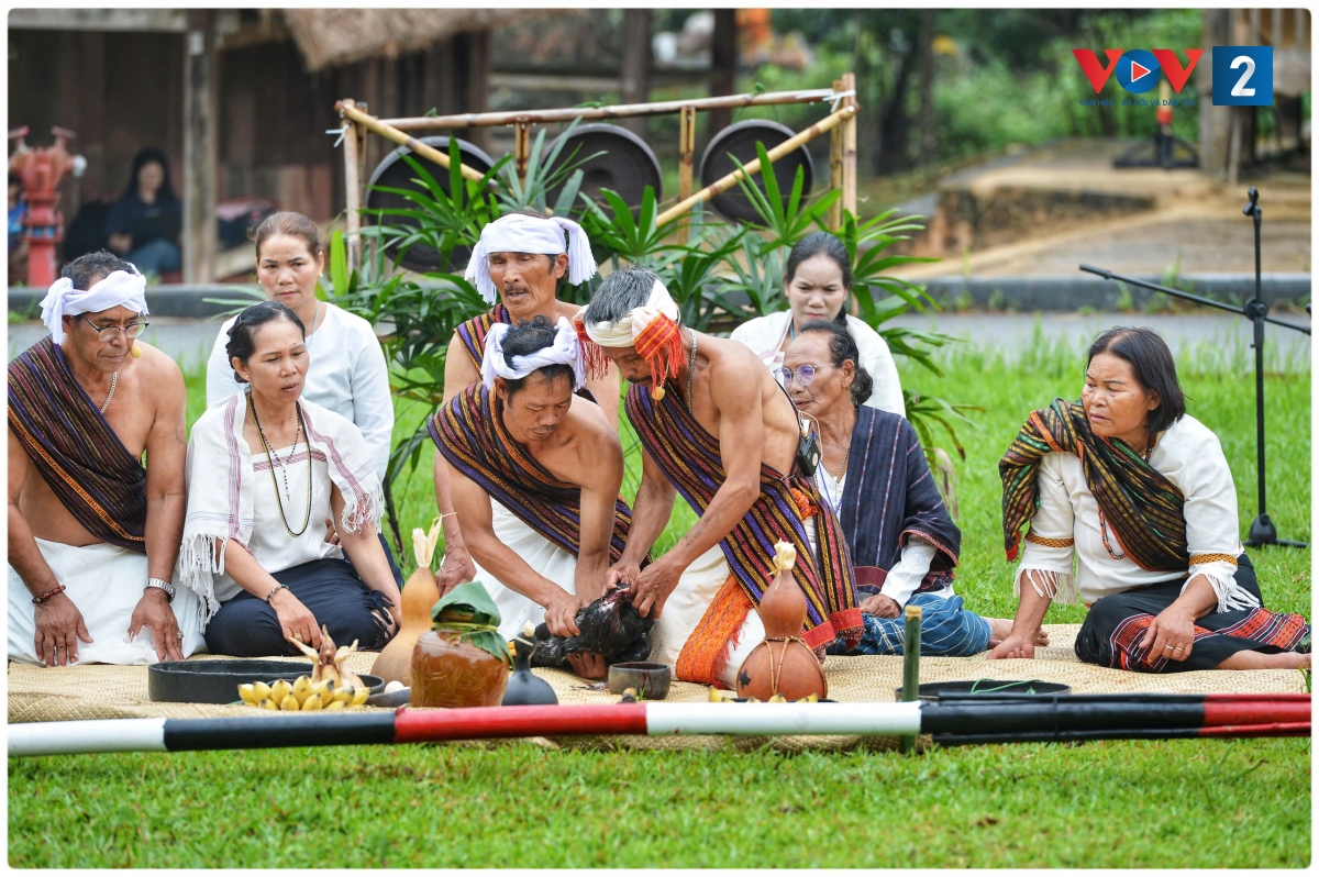 Già làng cắt tiết gà lấy máu bôi theo 7 đốt của cây Nêu theo hướng từ gốc lên ngọn. Sau đó, ông cùng hững người trong dòng họ khiêng cây Nêu chạy quanh mâm lễ, bắt đầu khấn.